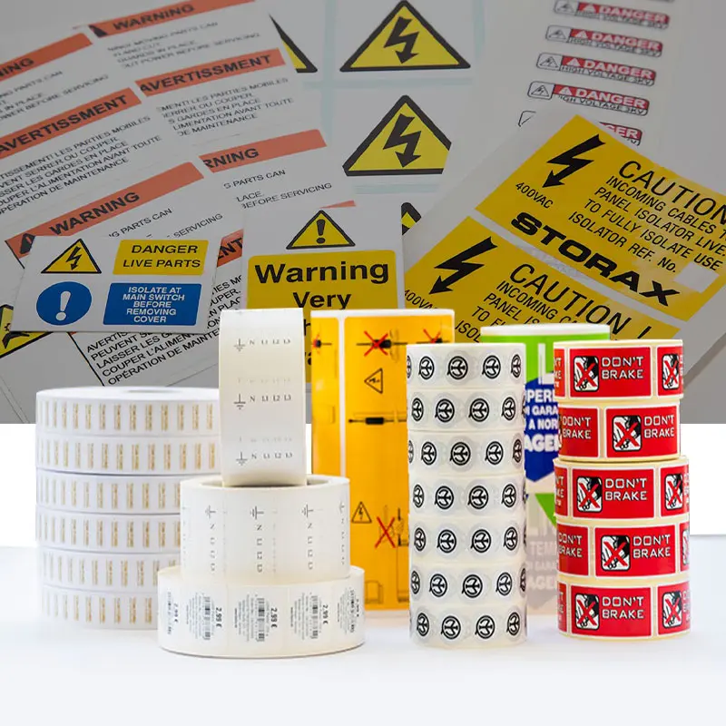 High‑visibility, solvent‑resistant labels with standardized hazard symbols and safety instructions for tank, drum, and piping.